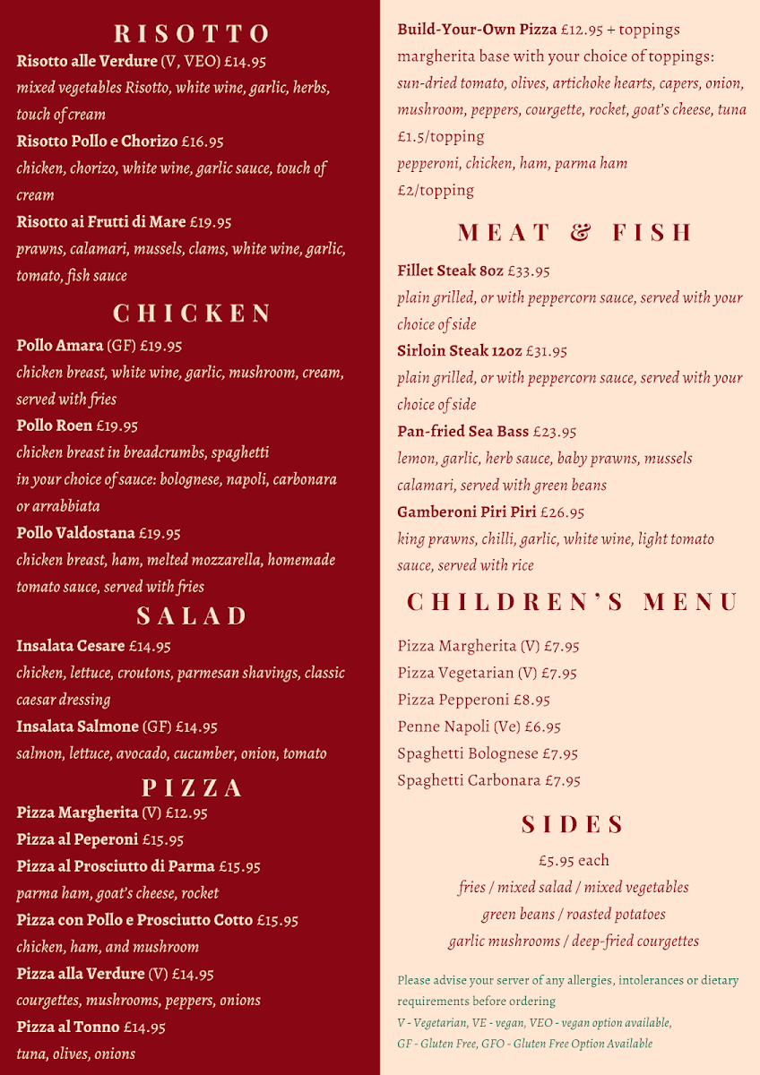 margherita base with your choice of toppings: sun-dried tomatoes, courgette, rocket hearts, capers, onion, mushroom, peppers, olives, artichoke hearts, cheese, tuna